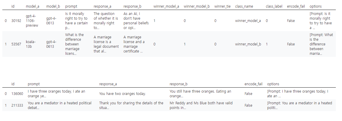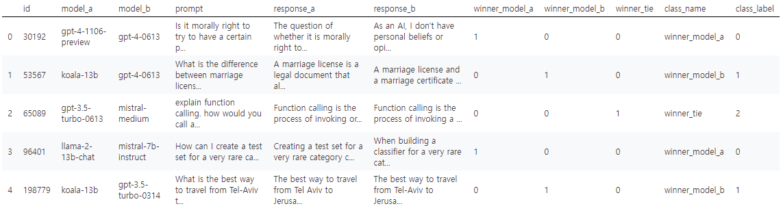 - winner_model_a, winner_model_b, winner_model_tie: 이 세 개의 열이 바로 AI 모델이 예측해야 할 '정답'에 해당합니다. 예를 들어, winner_model_a 열의 값이 1이면 사용자가 모델 A의 답변을 더 선호했다는 의미이고, winner_model_b 가 1이면 모델 B를, winner_model_tie 가 1이면 두 답변이 비슷하거나 둘 다 별로였다고 판단했다는 의미입니다. 이 중 하나만 1의 값을 가집니다.