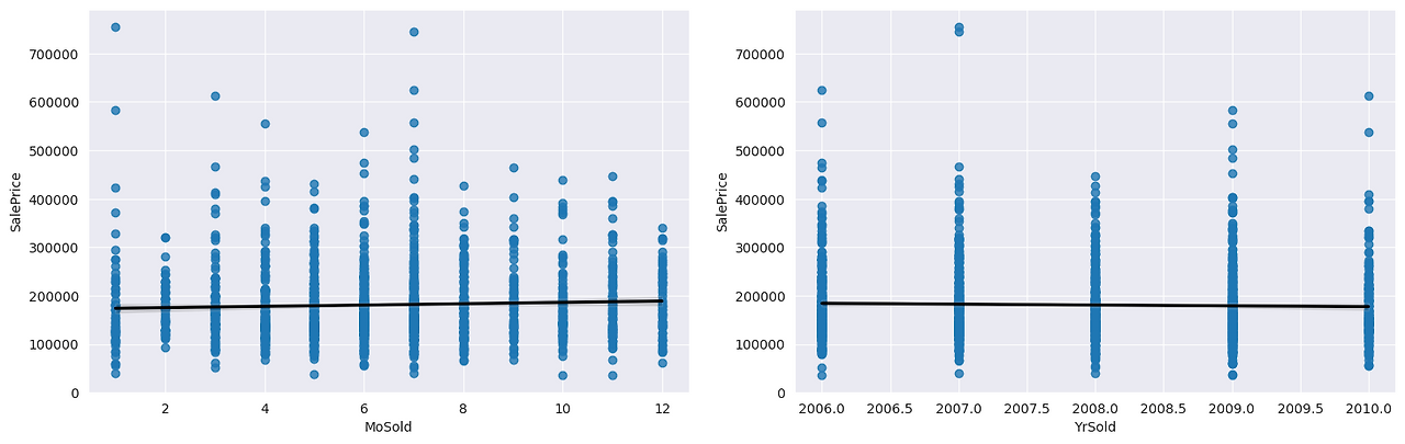 MoSold와 YrSold는 주택 가격인 SalePrice와 선형적인 관계가 거의 없으며, 이를 시각화한 그래프에서도 별다른 패턴이나 관계를 확인할 수 있었습니다. 따라서 이 변수들은 모델링 과정에서 불필요한 영향을 줄 수 있으므로, 제거하는 것이 바람직합니다.
