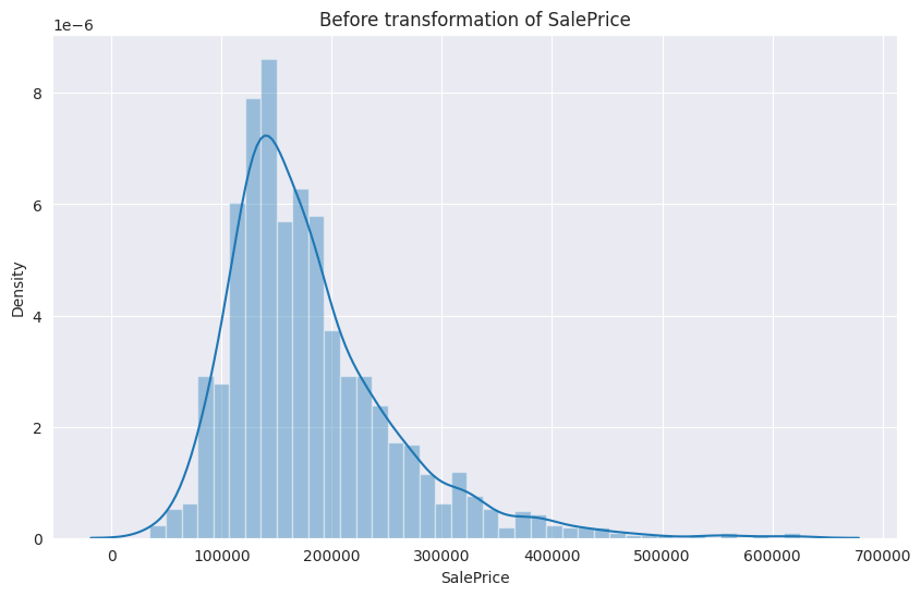 머신러닝 모델은 보통 잔차(residual) 가 정규분포를 따를 때 더 안정적이고 예측 성능이 좋아집니다. 그러므로 타겟 열인 SalePrice의 분포를 확인해서 skewed 되어있는지 확인하겠습니다.